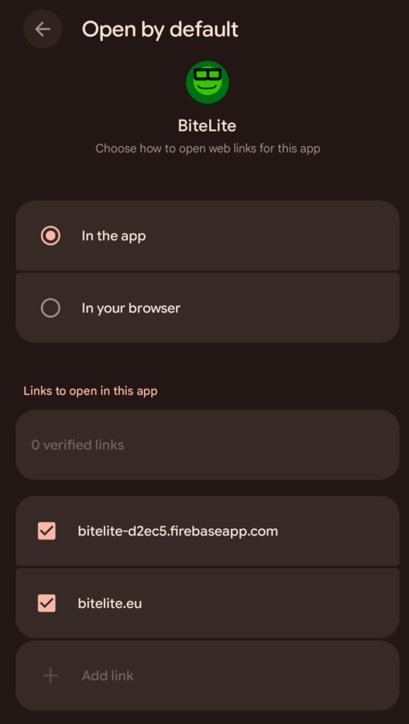 Bitte gehe unter Einstellungen> Apps> BiteLite auf „Standardmäßig öffnen“/ „Open by default“ und füge diese Links hinzu: